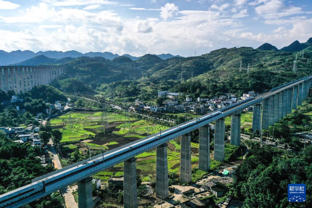 10月17日,一列试验列车通过攀西三标段清水河镇大桥贵州省ng高铁(无人机照片)。