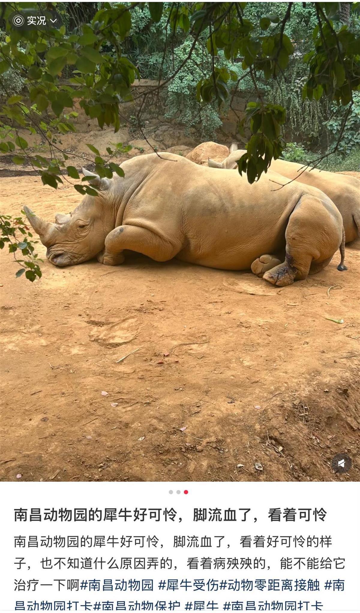 南昌动物园的犀牛腿部伤口已经好几天没有治疗了?帕克:发现带状疱疹的伤者接受了药物治疗; “血迹”其实是药物残留